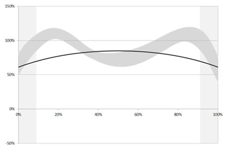 There are two mechanisms by which we get over this. The first is that we use our muscles so that the the ground reaction does not just mimic the mechanics of a passive inverted pendulum. In the figure below the ground reaction is under an inverted pendulum (solid line) is plotted against Winter’s data (1991) for the vertical component of the ground reaction (grey band) from the middle of one double support phase to the next. The characteristics double bumps of the ground reaction clearly increase the average vertical force (all forces are plotted as % bodyweight).