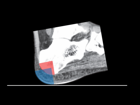 After quite a lot of head scratching we found out that the artefact (in how markers on the medial, posterior, and lateral calcaneus move) can be explained quite easily if the calcaneus rolls forward in the first 50ms or so of stance (and takes the rest of the foot with it). This makes quite a lot of sense as the foot is rotating quite fast (approx. 200°/s) immediately before foot contact and we know that the foot is lowered to the floor over approximately this period. When I went and looked at a few x-rays this seems to relate very well to the functional anatomy of the calcaneus which has an almost circular posterior-distal aspect in the sagittal plane (red quarter circle in animation below). A recent paper on the anatomy of the heel pad confirms that it too wraps around onto the posterior aspect of the calcaneus which would allow cushioning of the calcaneus throughout any such rolling motion (blue quarter circle in animation below). I’ve not seen this mechanism described in exactly this way before but it is, of course, very similar to the Perry’s first rocker of stance.